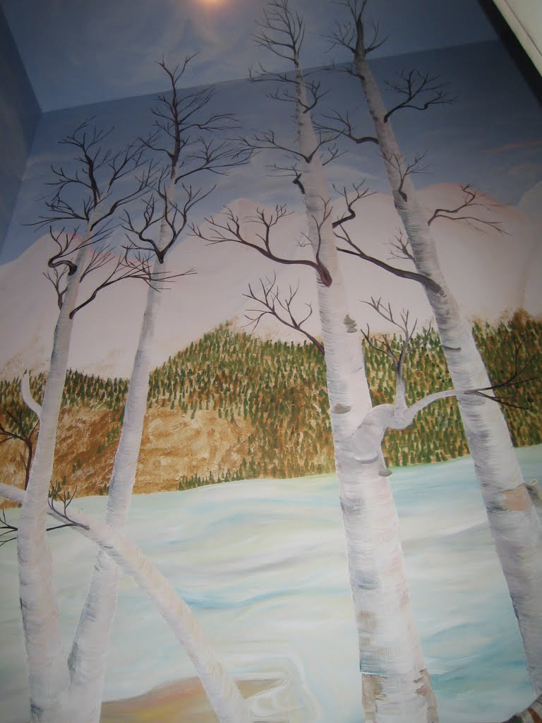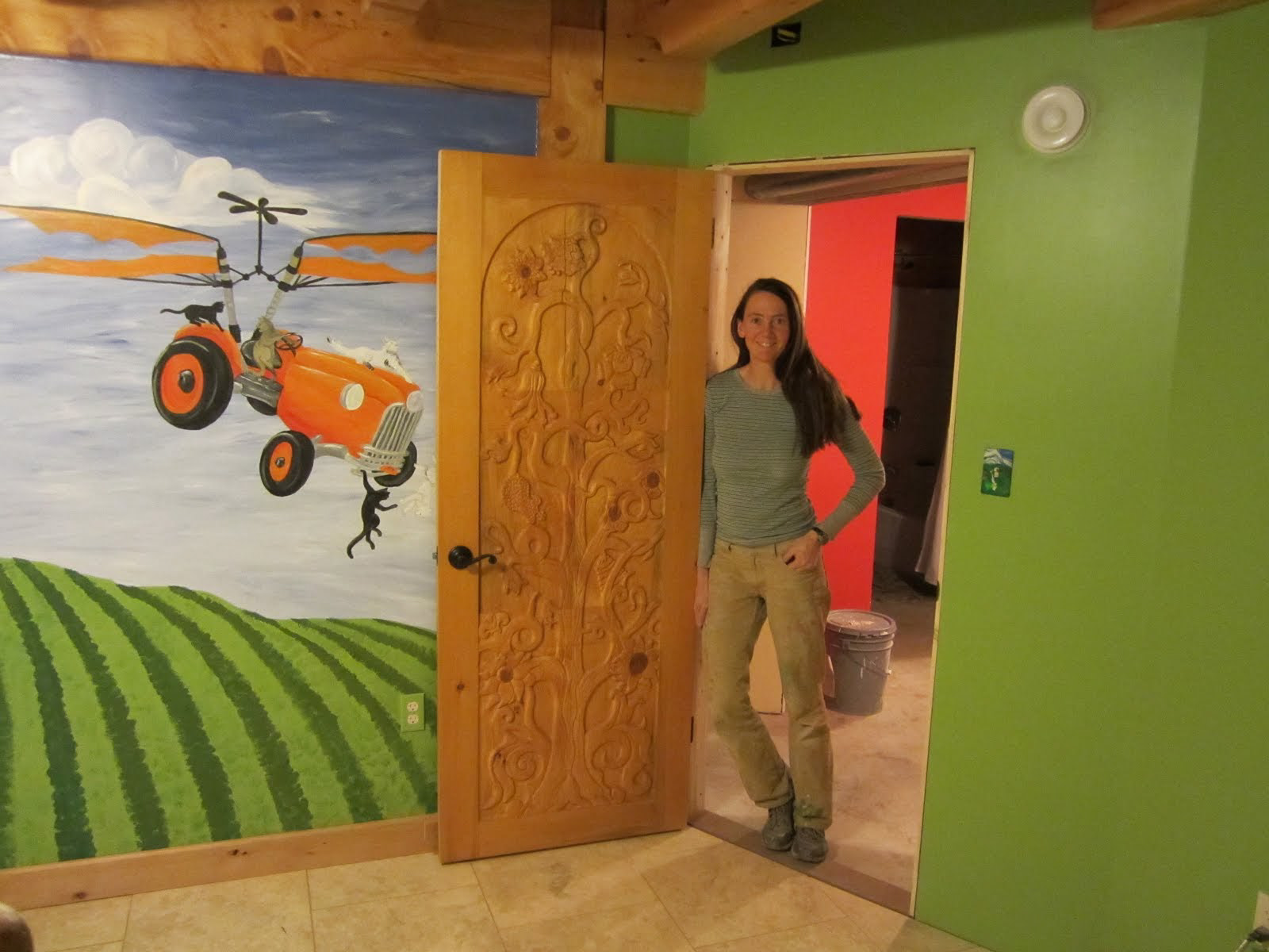 This carved door and wall mural bring elements of the outdoors and of fantasy into this child's bedroom.