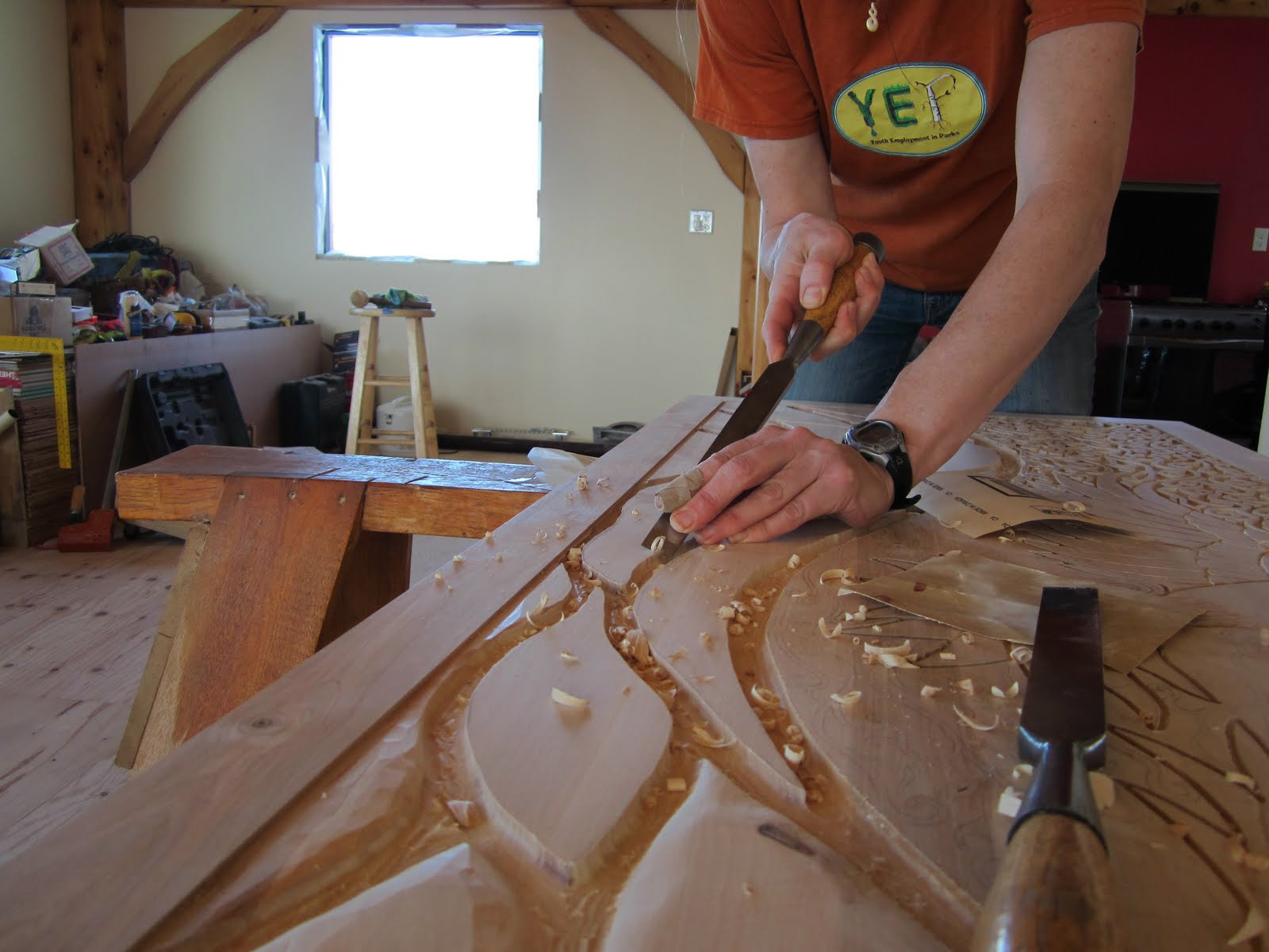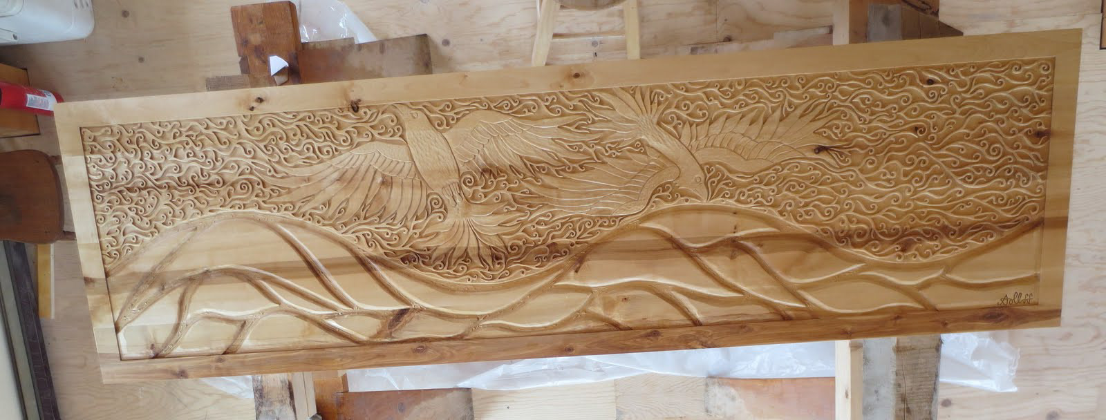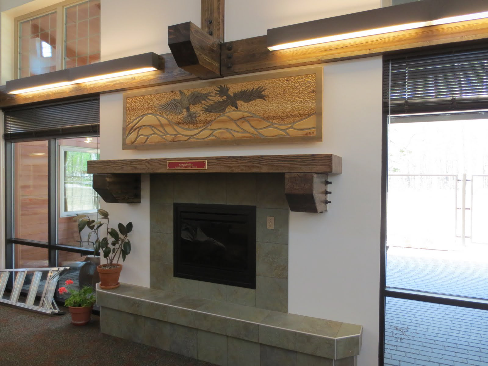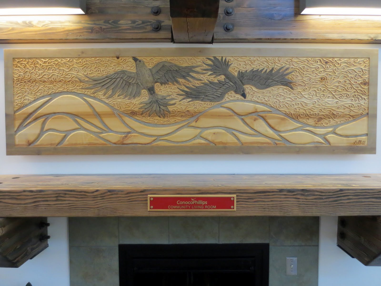 Friends of Sutton Public Library commissioned this carved birch panel to be hung above the new library's fireplace. The Wind and water are inspired by the Matanuska river valley.