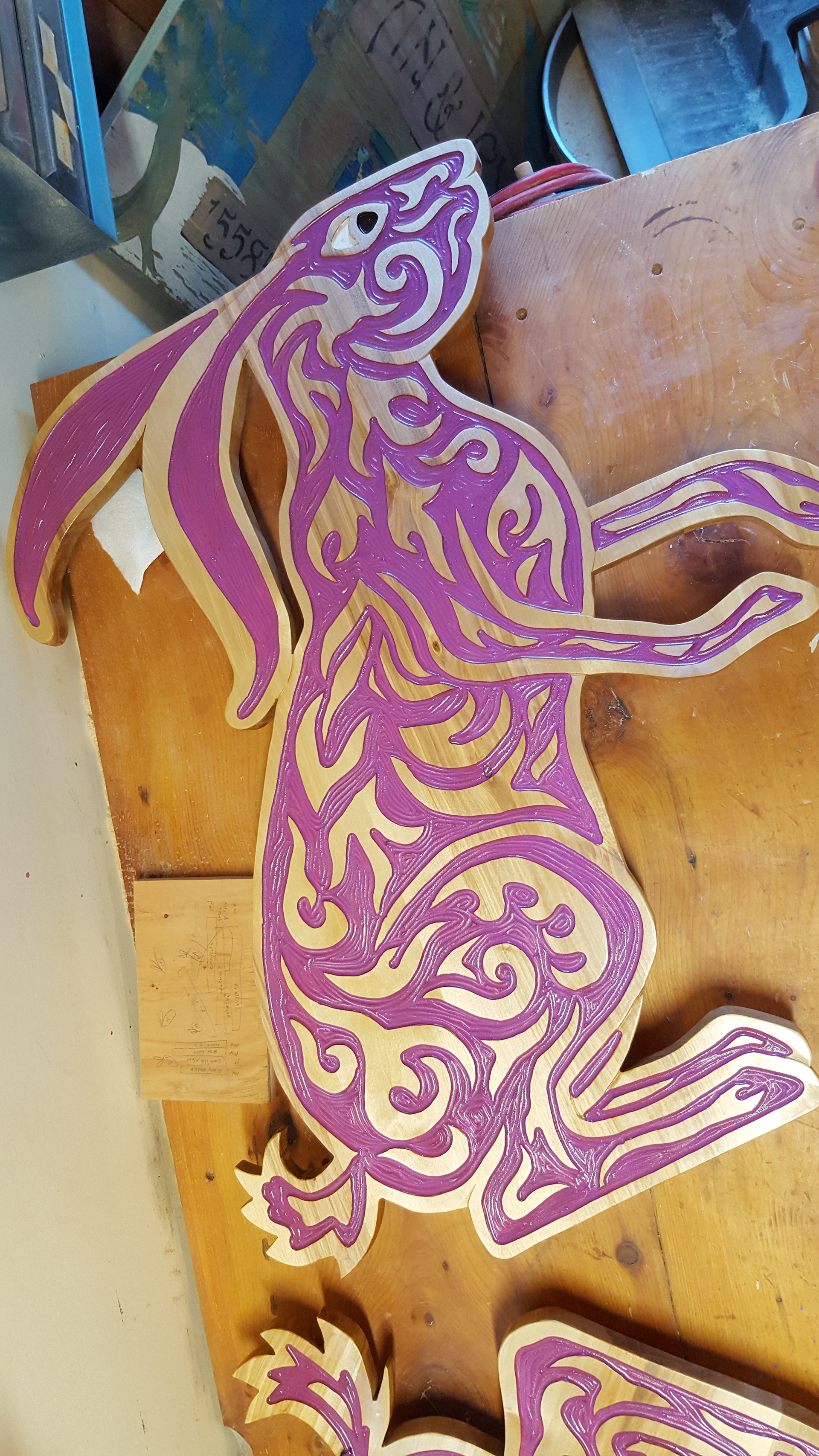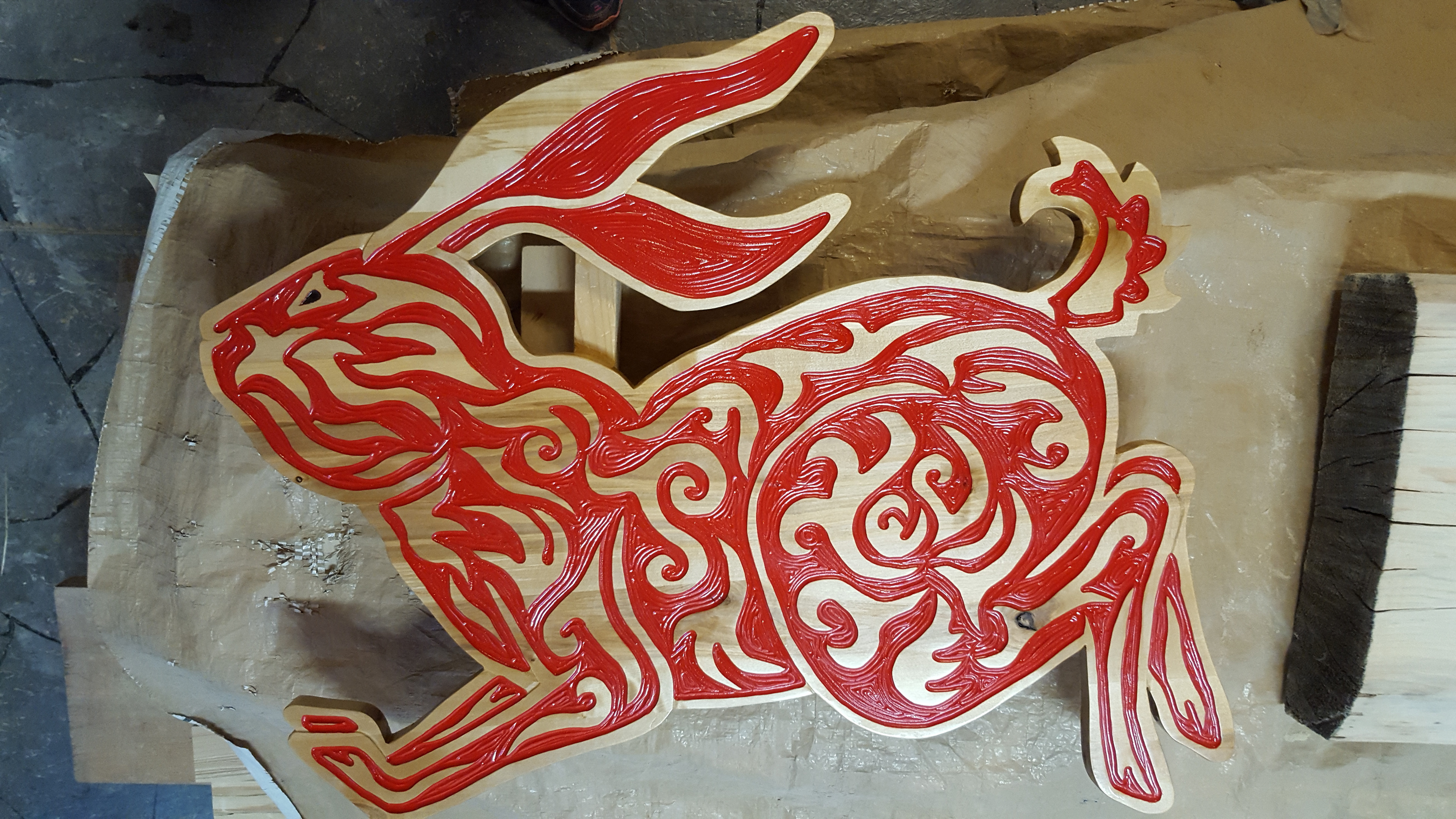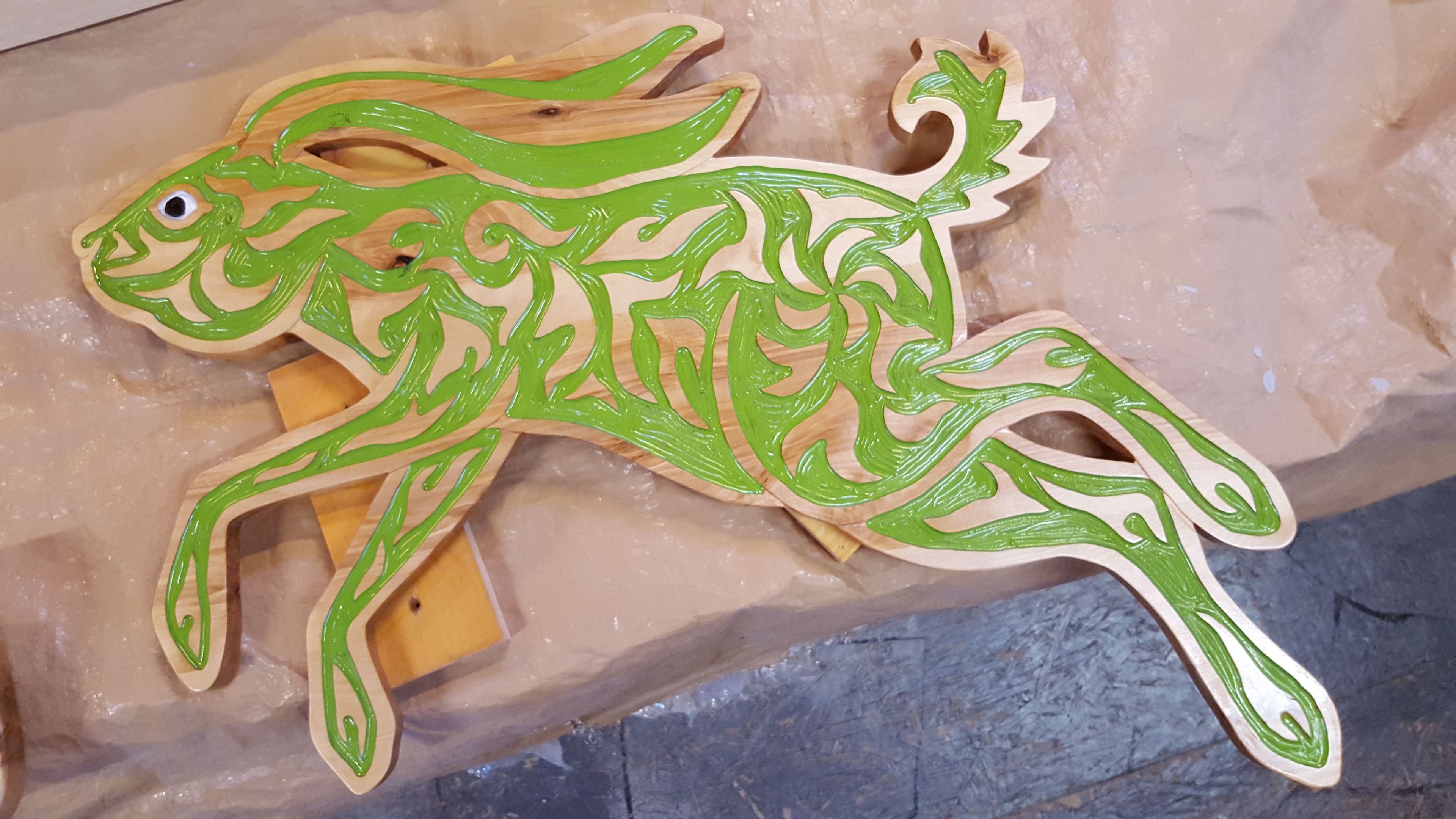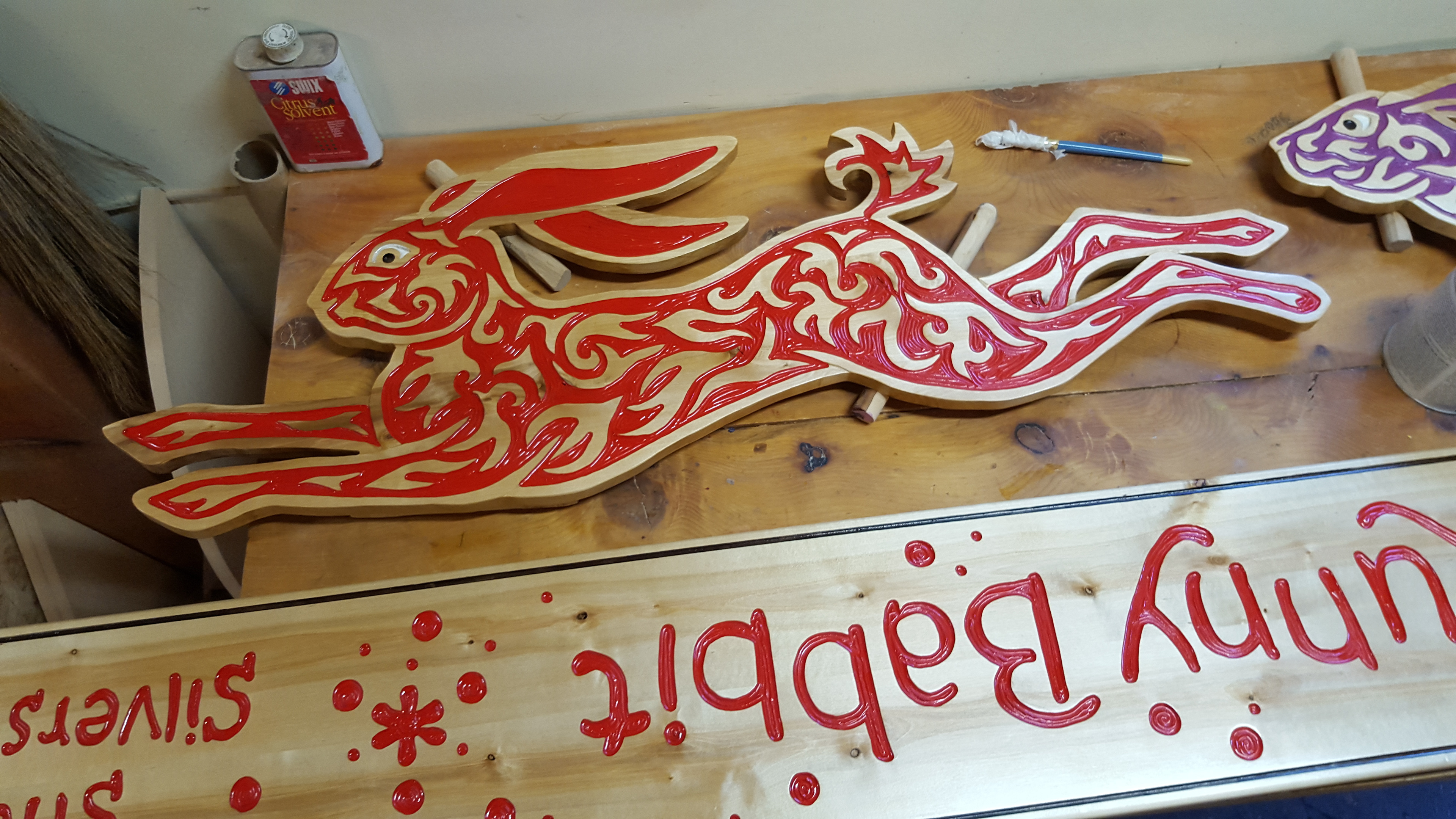 The Matanuska Susitna Valley Borough's 1% for Art program funded this 12' x 8' carving installation. The carved book spines mimic the trunks of birch trees out the windows and are labeled with titles of popular children's books featuring rabbit and hare characters. The hares themselves leap and frolic among the books, adding a sense of joy and adventure to the youth section of the new library.